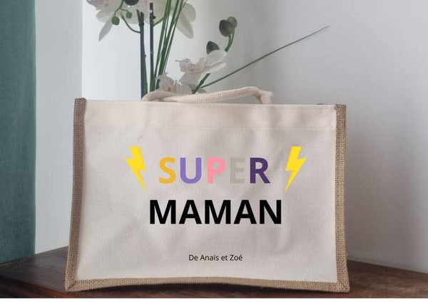 Parce que chaque maman est une super-héroïne, ce cabas affiche fièrement son message : "Super maman" 👑. Avec son design cool et moderne, il est parfait pour toutes les mamans qui jonglent avec brio entre les courses, les sorties au parc, le boulot et… les super-pouvoirs ! 💪